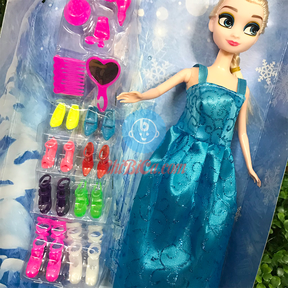 + Búp bê Elsa, váy dạ hội, 8 đôi giày, gương, lược, ....